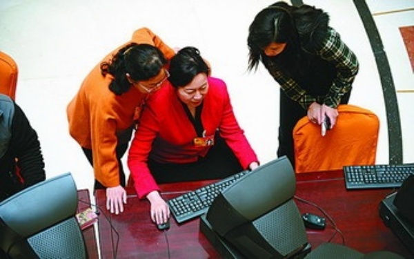 駐地的電腦服務(wù)中心是王晶代表(中)經(jīng)常光顧的地方,她和其他代表在此查詢(xún)相關(guān)資料。